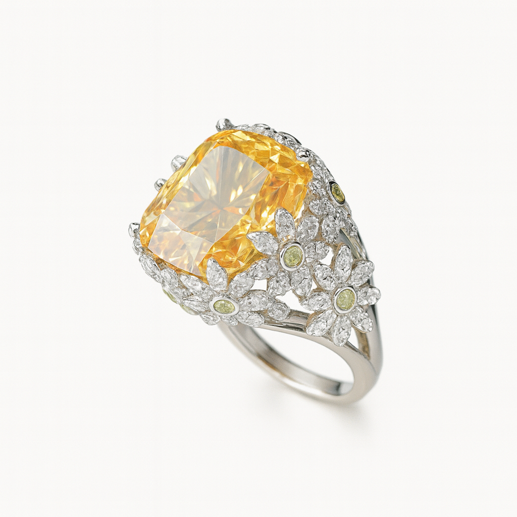 At its heart lies a vivid yellow-orange gemstone, surrounded by a poetic constellation of diamond-paved petals.