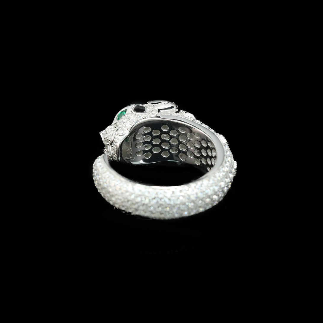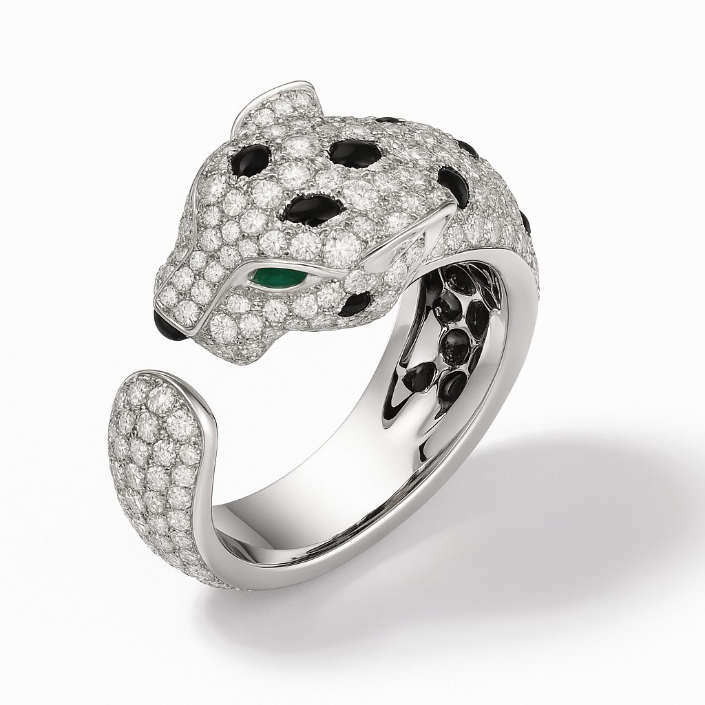 The panther’s head is paved with brilliant white stones, contrasted by sleek black onyx spots and piercing emerald-green eyes, evoking both power and grace.