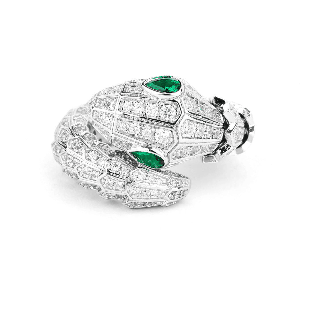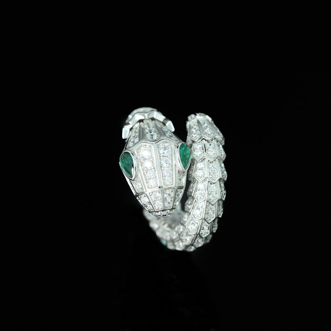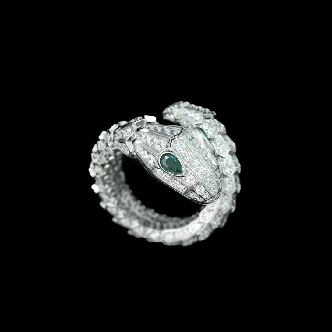 A serpent of brilliance coils around the finger, its body paved with shimmering diamonds and eyes gleaming in deep emerald green.